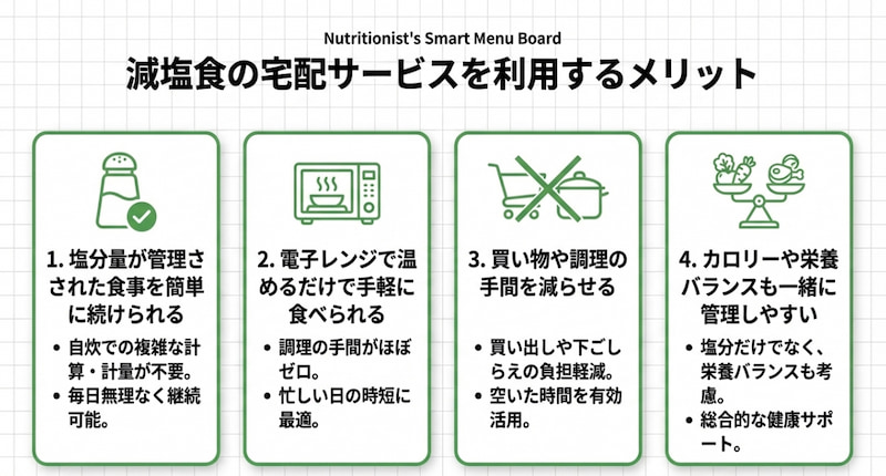 減塩食の宅配サービスには、健康管理を続けやすくする多くのメリットがあります。