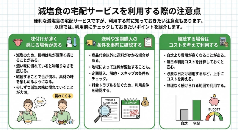 便利な減塩食の宅配サービスですが、利用する前に知っておきたい注意点もあります。
