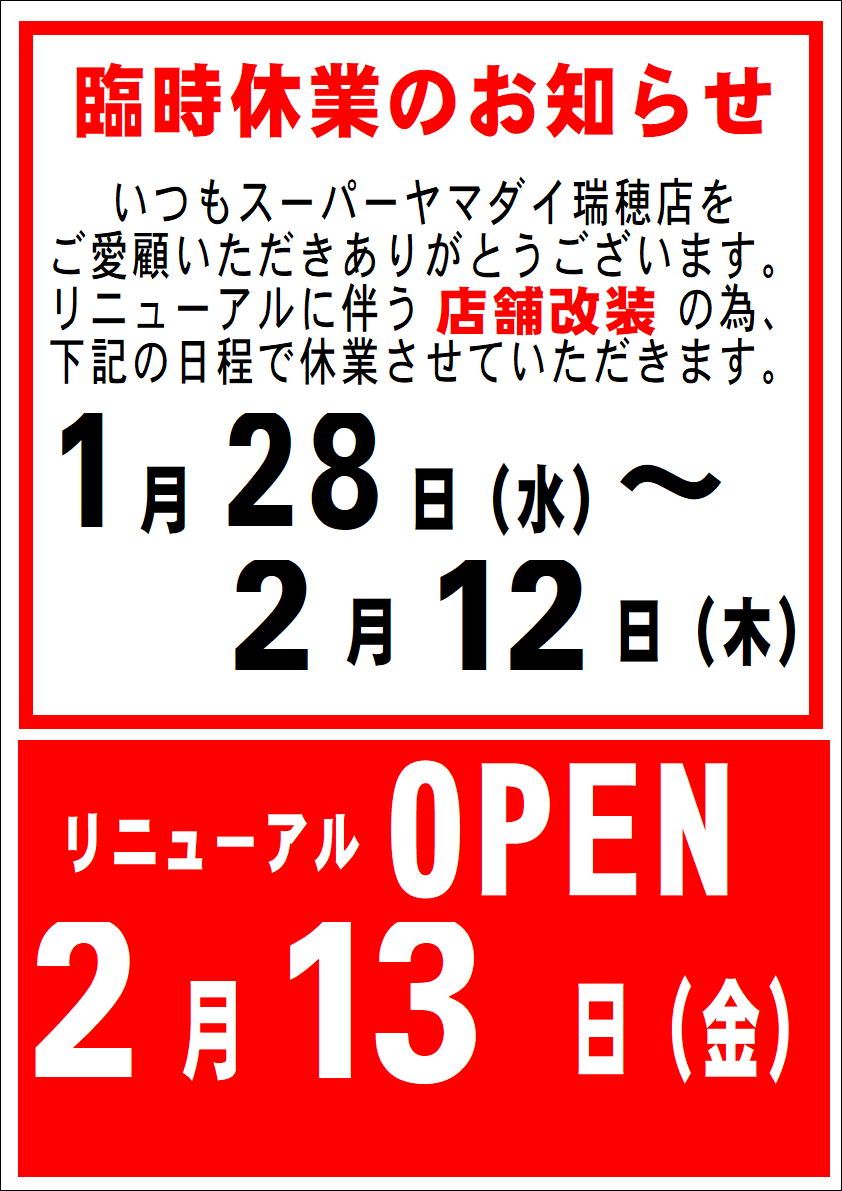 ホームお知らせ瑞穂店 店舗改装のため1月28日(水)~2月12日(木)までお休みいたします。 2月13日リニューアルオープン‼瑞穂店 店舗改装のため1月28日(水)~2月12日(木)までお休みいたします。 2月13日リニューアルオープン‼2026.01.14 この記事のタイトルとURLをコピーする Tweet Share Hatena Pocket RSS feedly Pin it 「食の勉強会」令和8年1月24日(土)開催前の記事