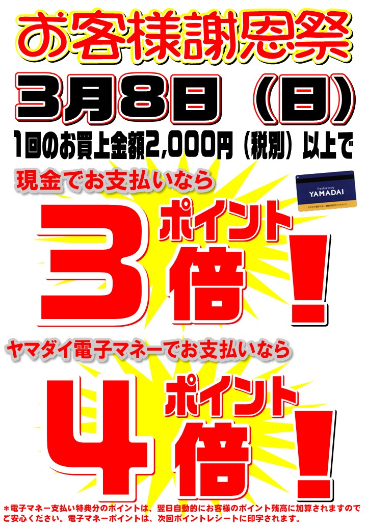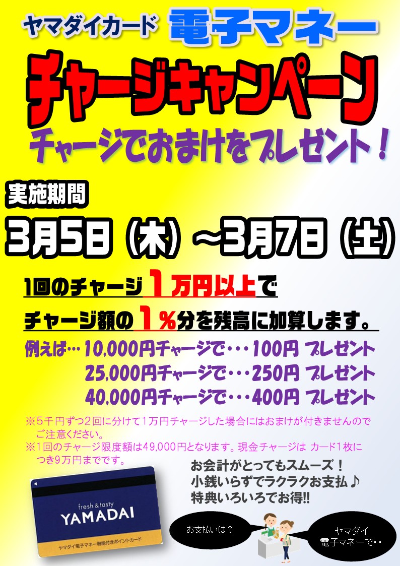 ホームお知らせ3月5日(木)~7日(土) ヤマダイカード電子マネー チャージキャンペーン&8日(日)お客様謝恩祭3月5日(木)~7日(土) ヤマダイカード電子マネー チャージキャンペーン&8日(日)お客様謝恩祭2026.02.28 この記事のタイトルとURLをコピーする Tweet Share Hatena Pocket RSS feedly Pin it 毎週火曜日 電子マネーお得キャンペーン!前の記事